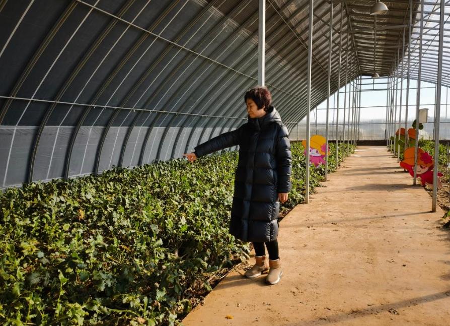 1月3日,天津市小沙窝村谷力果蔬种植农民专业合作社总经理郝立红在沙窝萝卜核心产区科技示范基地介绍沙窝萝卜的种植情况。新华社记者宋瑞 摄
